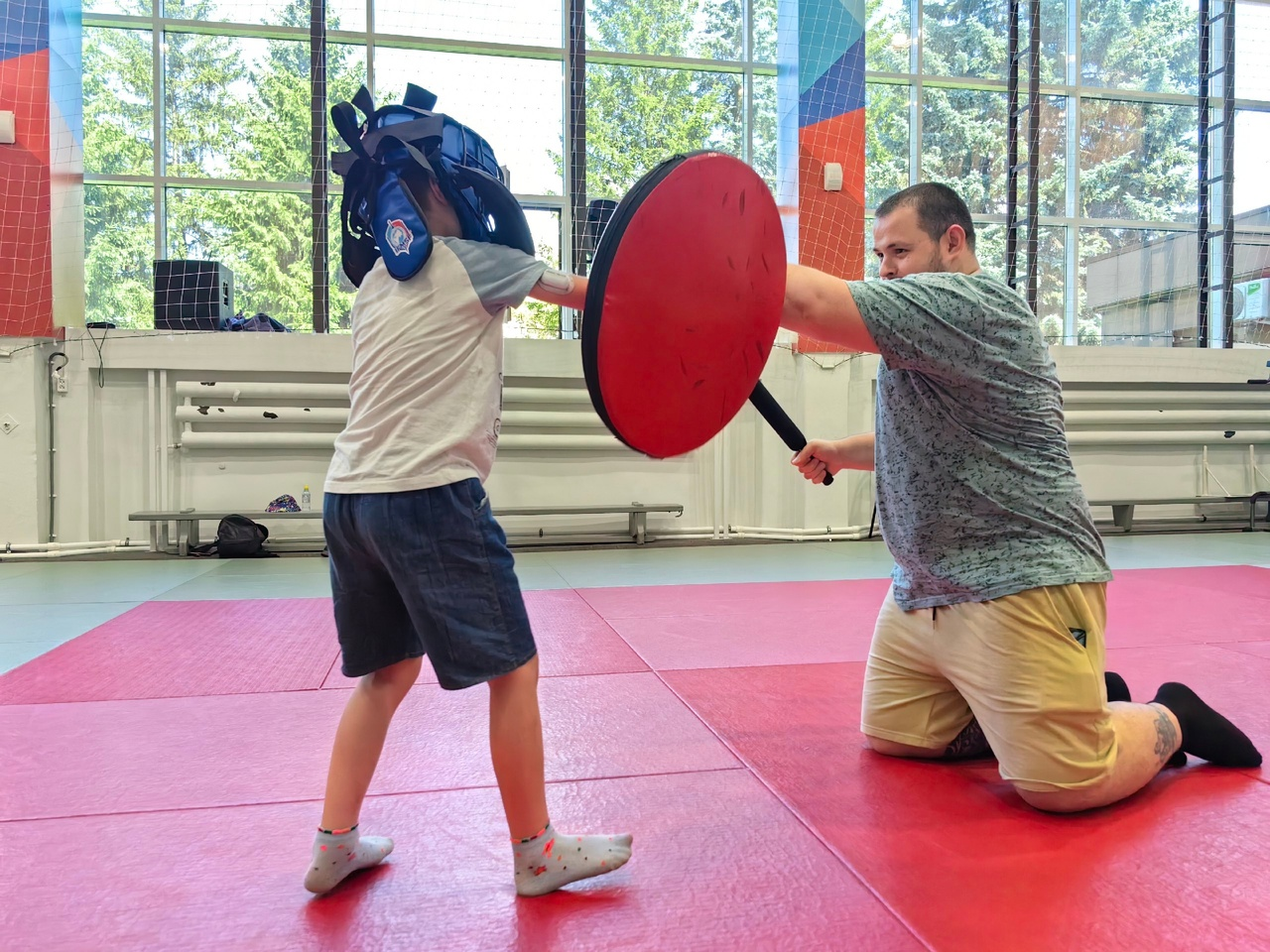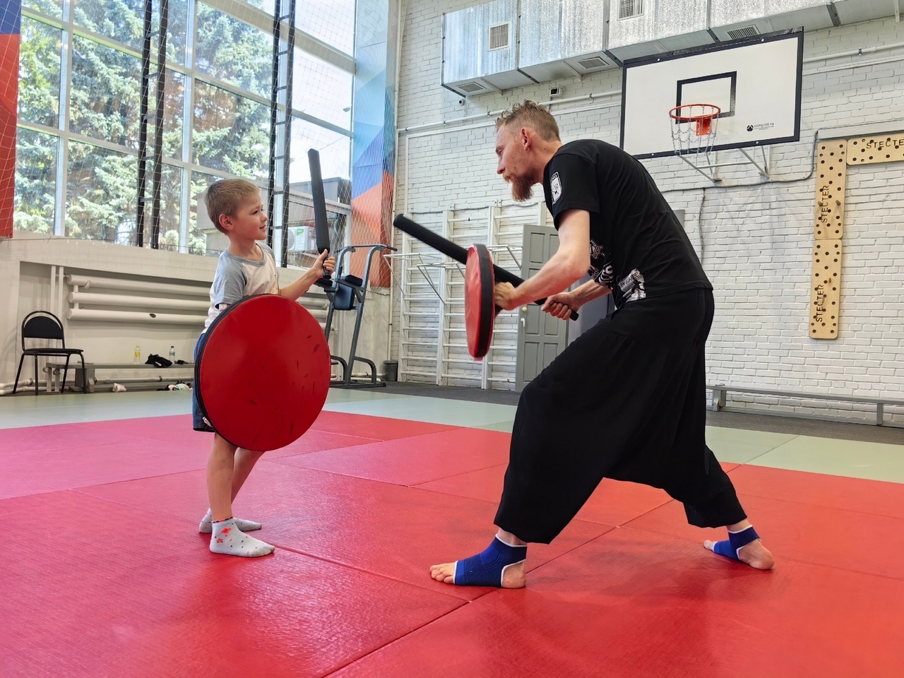 Без пяти минут первоклассник Михаил приходит на занятия фехтовальной секции вместе с папой Александром. Папа не сидит на скамеечке, а тренируется вместе с сыном и активно ассистирует Владимиру.