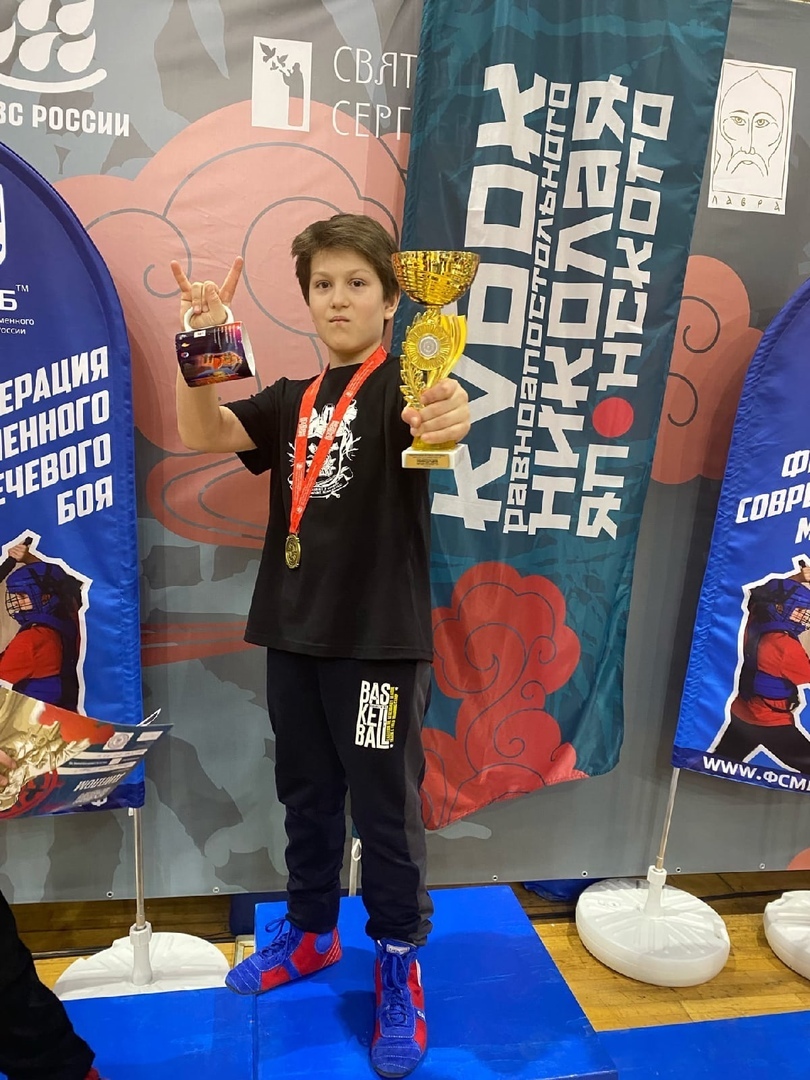 Итоги: Мирослав в составе сборной Урала взяли 1 место в командных боях 5*5 щит/меч, возраст 8-9 лет