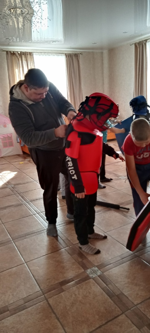 Ввиду отсутствия зала, тренировка проходила у меня дома. Разминку, беговую тренировку и игры (терминаторы, три камня, пальчиковое фехтование) провели на улице во дворе, бои проходили в доме (очень холодно было на улице). Учитывая, что тренировка первая, ребята бились без счета, с целью просто побиться. Комплектов защиты всего два, поэтому бились вкруг, чтобы все побились со всеми.