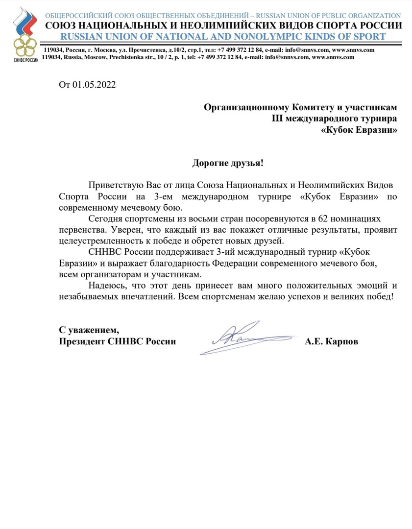 Наш lll Кубок Евразии по СМБ 1 мая 2022 в Москве поддержал Анатолий Евгеньевич КАРПОВ - президент Союза Национальных и Неолимпийских Видов Спорта России.